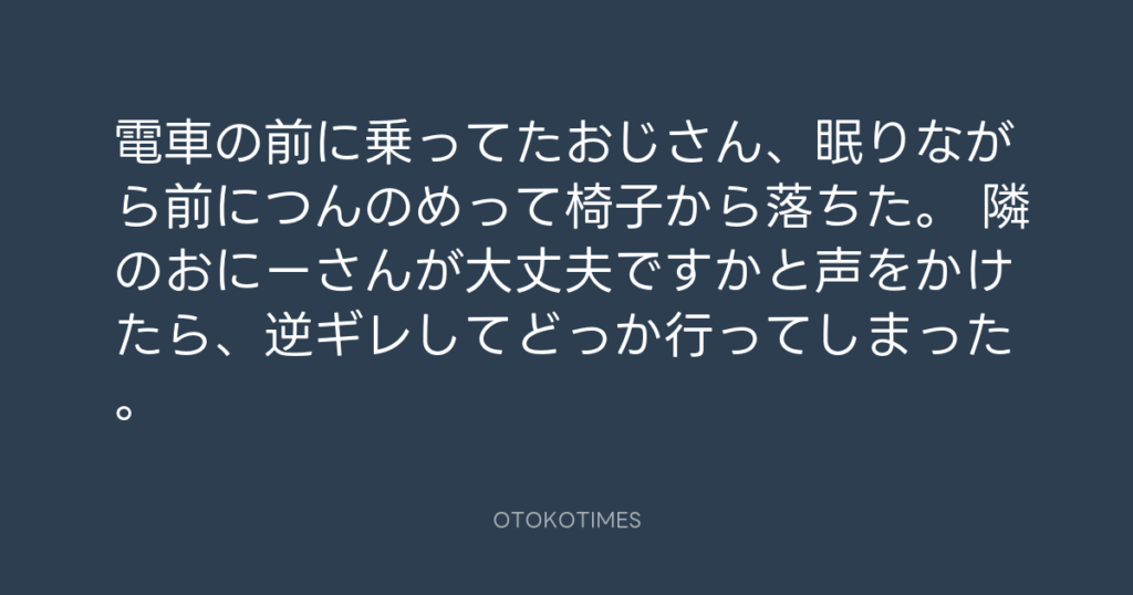電車の前に乗ってたおじさん、眠りながら前につんのめって椅子から落ちた。 隣のお... -