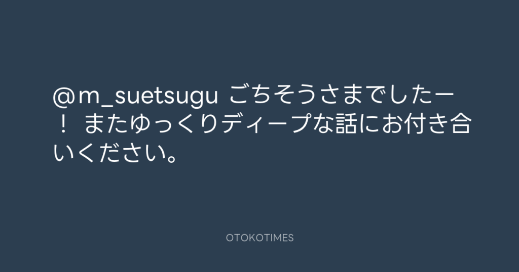 @m_suetsugu ごちそうさまでしたー! またゆっくりディープな話にお付き合いくださ... -