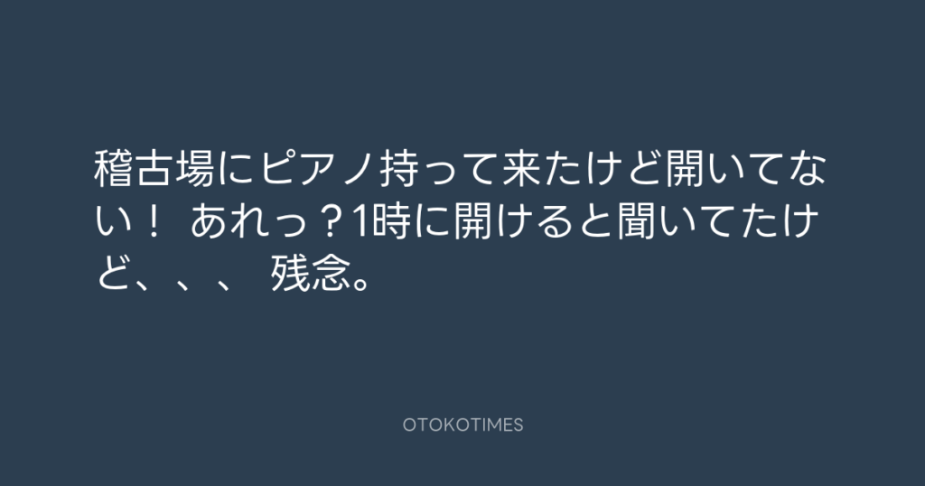 稽古場にピアノ持って来たけど開いてない! あれっ?1時に開けると聞いてたけど、... -