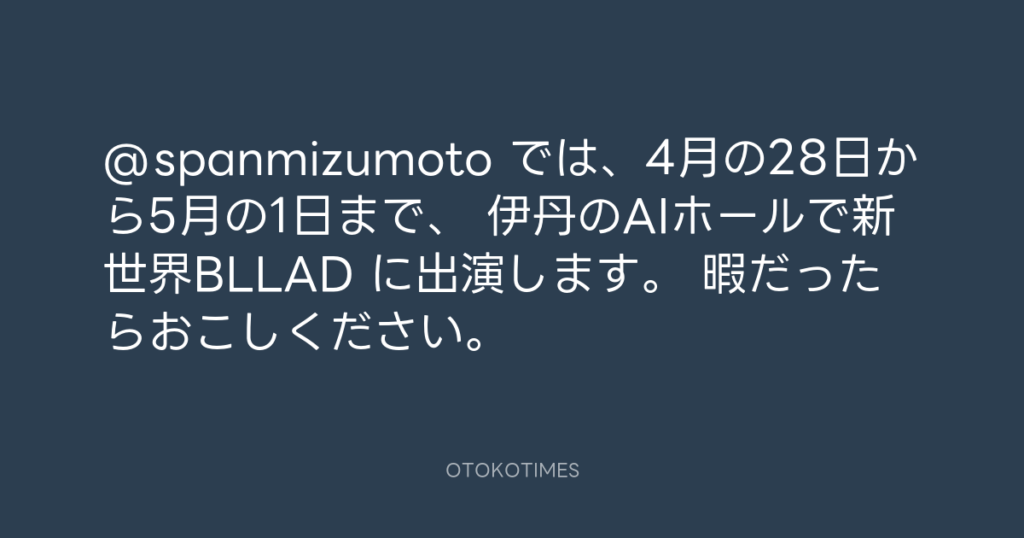 @spanmizumoto では、4月の28日から5月の1日まで、 伊丹のAIホールで新世界BLLAD ... -