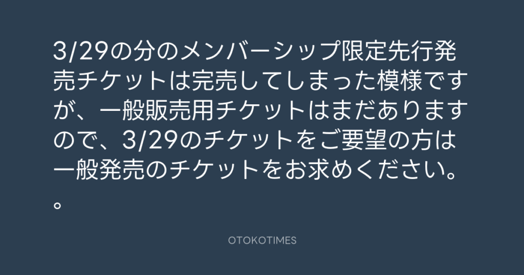 3/29の分のメンバーシップ限定先行発売チケットは完売してしまった模様ですが、一... -