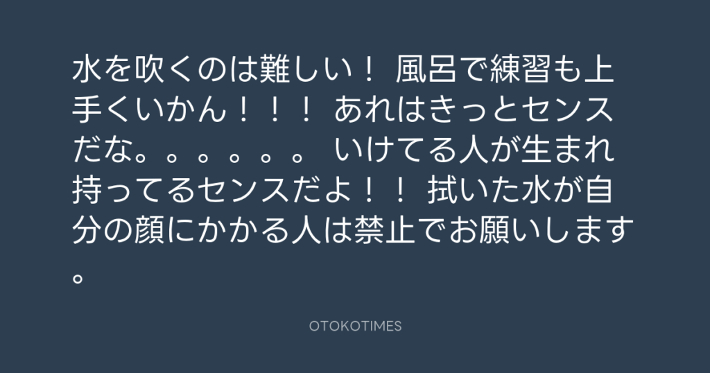 水を吹くのは難しい! 風呂で練習も上手くいかん!!! あれはきっとセンスだな。... -
