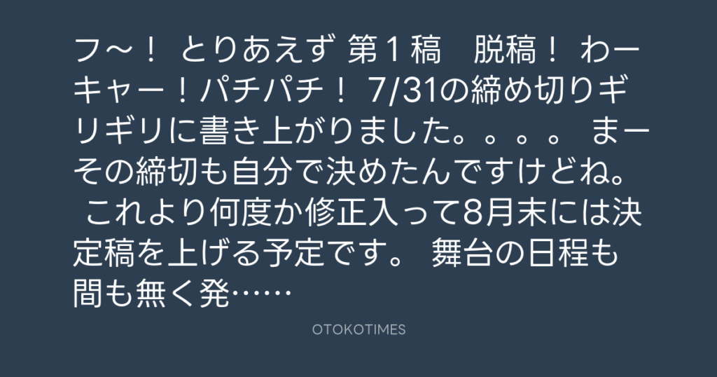 フ〜! とりあえず 第1稿 脱稿! わー キャー!パチパチ! 7/31の締め切りギリ... -