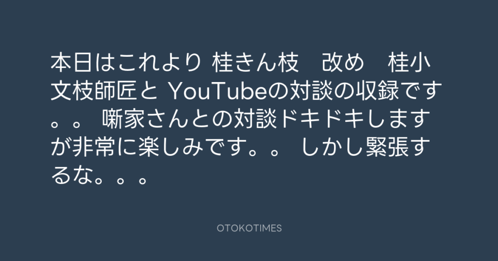 本日はこれより 桂きん枝 改め 桂小文枝師匠と YouTubeの対談の収録です。。 噺... -