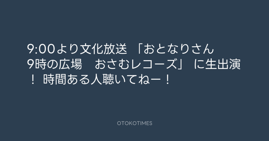 9:00より文化放送 「おとなりさん 9時の広場 おさむレコーズ」 に生出演! 時...