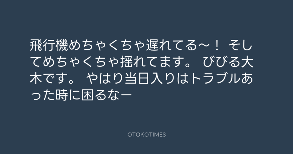 飛行機めちゃくちゃ遅れてる〜! そしてめちゃくちゃ揺れてます。 びびる大木です... -