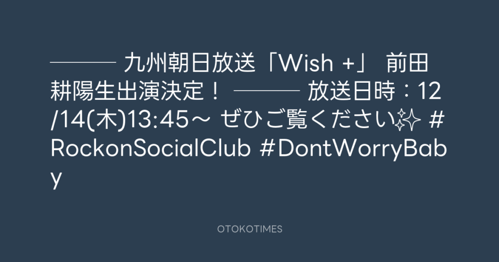 📺─── 九州朝日放送「Wish +」 前田耕陽生出演決定! ───📺 放送日時:12/14(木)13... -
