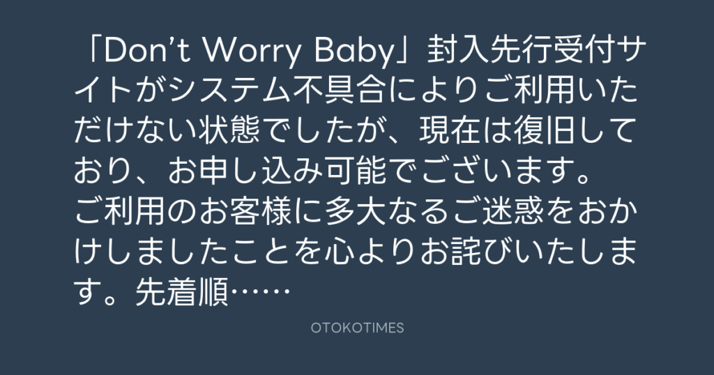 「Don’t Worry Baby」封入先行受付サイトがシステム不具合によりご利用いただけな... -