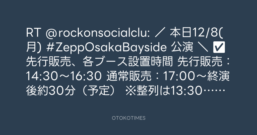 RT @rockonsocialclu: / 本日12/8(月) #ZeppOsakaBayside 公演🎸 \ ✅先行販売、... -