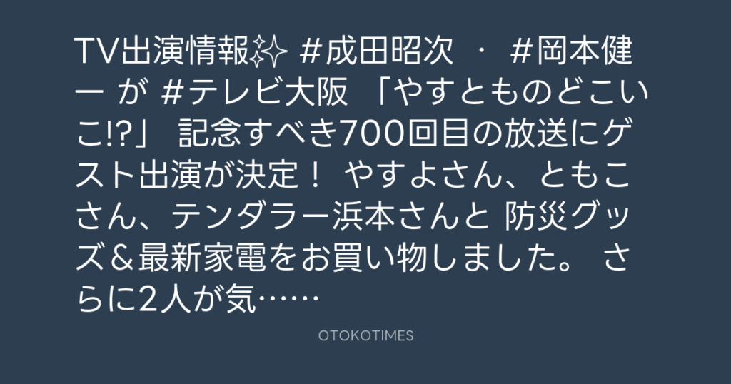 📺TV出演情報✨ #成田昭次 ・ #岡本健一 が #テレビ大阪 「やすとものどこいこ!?」... -