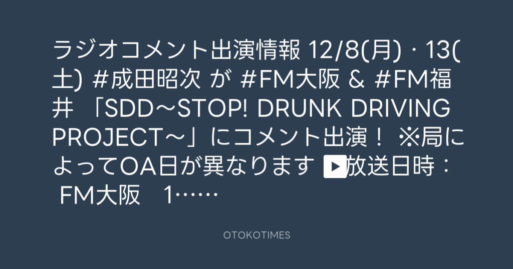 📢ラジオコメント出演情報📻 12/8(月)・13(土) #成田昭次 が #FM大阪 & #FM福... -