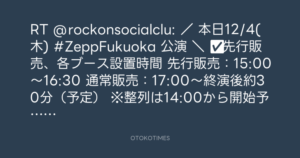 RT @rockonsocialclu: / 本日12/4(木) #ZeppFukuoka 公演🎸 \ ✅先行販売、各ブ... -