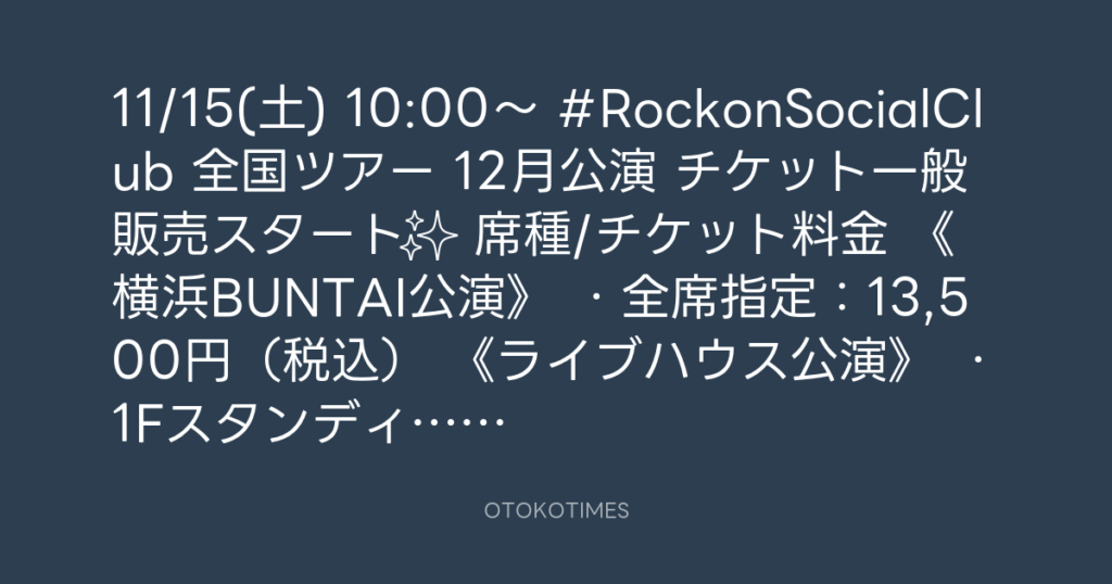 📢11/15(土) 10:00〜 #RockonSocialClub 全国ツアー 12月公演 チケット一般販売ス... -