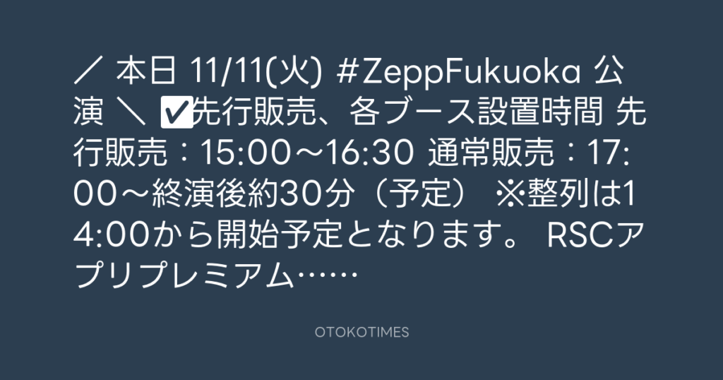 / 本日 11/11(火) #ZeppFukuoka 公演🎸 \ ✅先行販売、各ブース設置時間 先行販... -