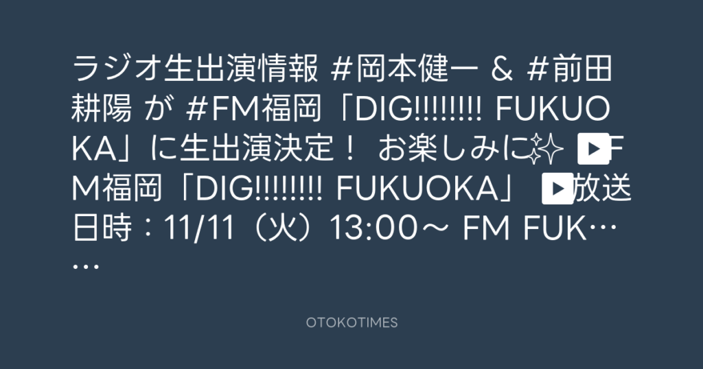 📢ラジオ生出演情報📻 #岡本健一 & #前田耕陽 が #FM福岡「DIG!!!!!!!! FUKUOK... -