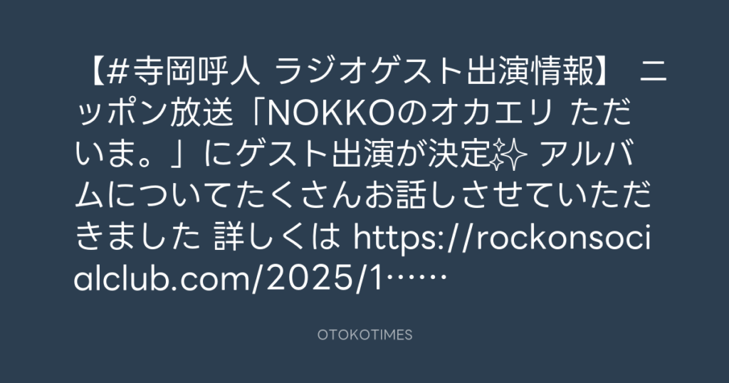 RT @rockonsocialclu: 【#寺岡呼人 ラジオゲスト出演情報】 ニッポン放送「NOKKOの... -