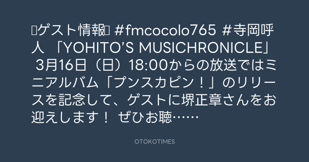 ◤📻ゲスト情報◢ #fmcocolo765 #寺岡呼人 「YOHITO’S MUSICHRONICLE」 3月16日(日... -