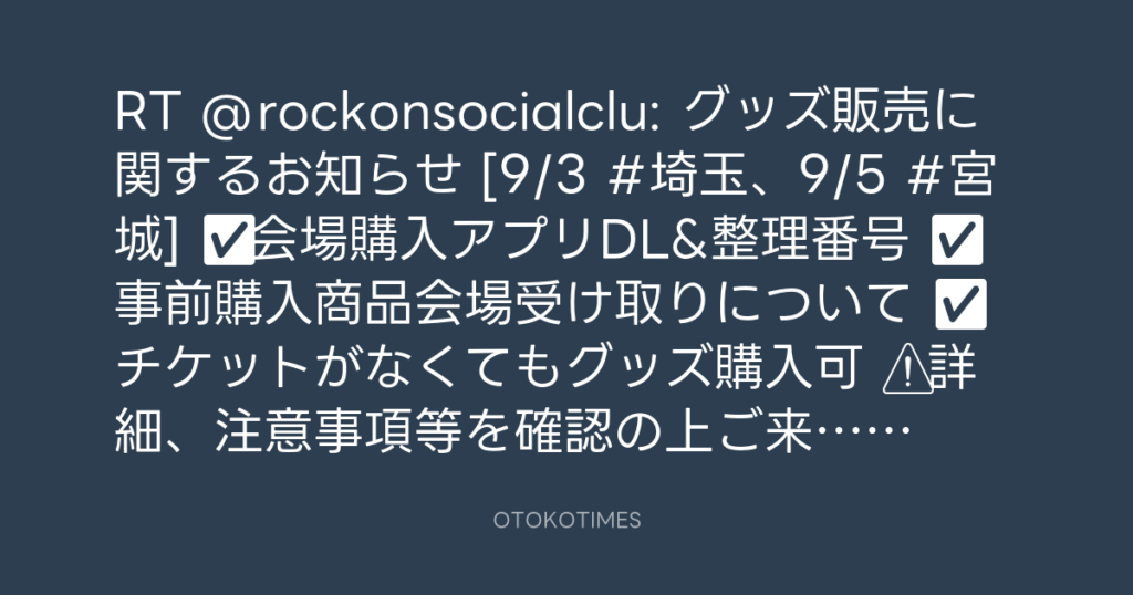 RT @rockonsocialclu: 📢グッズ販売に関するお知らせ [9/3 #埼玉、9/5 #宮城] ✅会... -