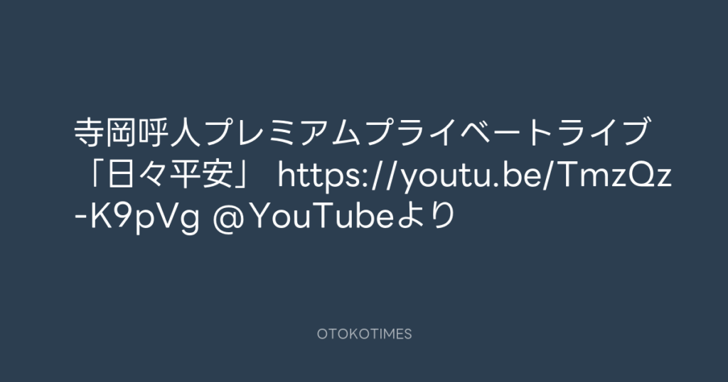 寺岡呼人プレミアムプライベートライブ 「日々平安」 https://youtu.be/TmzQz-K9p... -