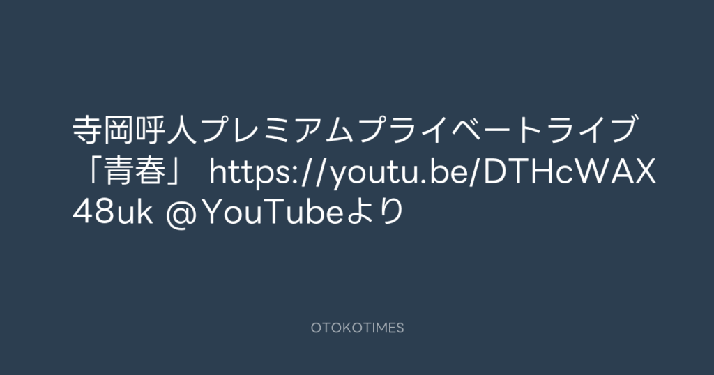 寺岡呼人プレミアムプライベートライブ「青春」 https://youtu.be/DTHcWAX48uk @Yo... -