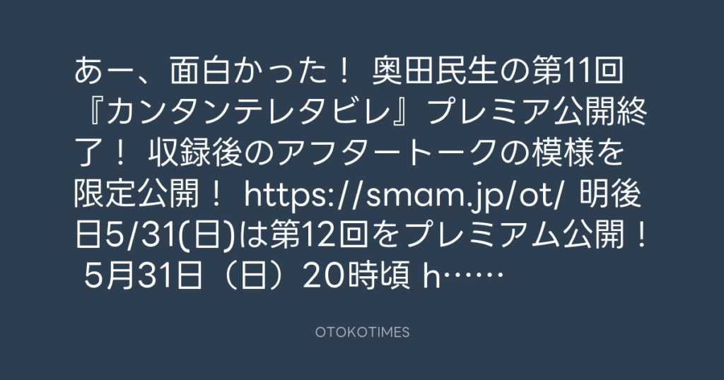 あー、昨日は笑ったなぁー! 奥田民生第11回『カンタンテレタビレ』明日5/31(日)は... -
