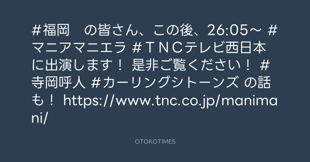 #福岡 の皆さん、この後、26:05〜 #マニアマニエラ #TNCテレビ西日本 に出演し...