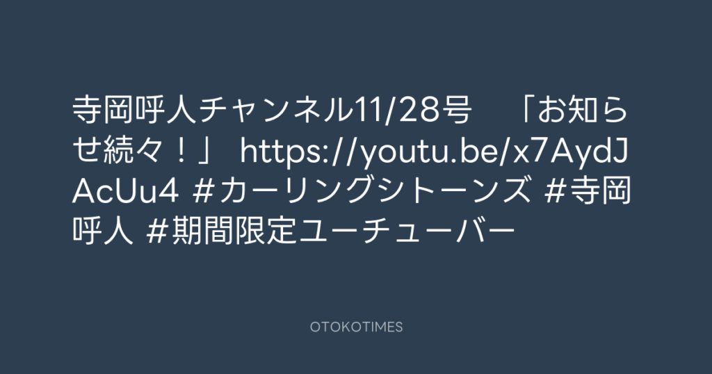 寺岡呼人チャンネル11/28号 「お知らせ続々!」 https://youtu.be/x7AydJAcUu4 #... -