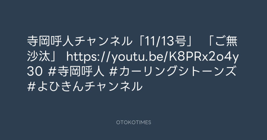 寺岡呼人チャンネル「11/13号」 「ご無沙汰」 https://youtu.be/K8PRx2o4y30 #寺岡... -
