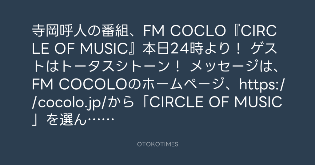 寺岡呼人の番組、FM COCLO『CIRCLE OF MUSIC』本日24時より! ゲストはトータスシ... -