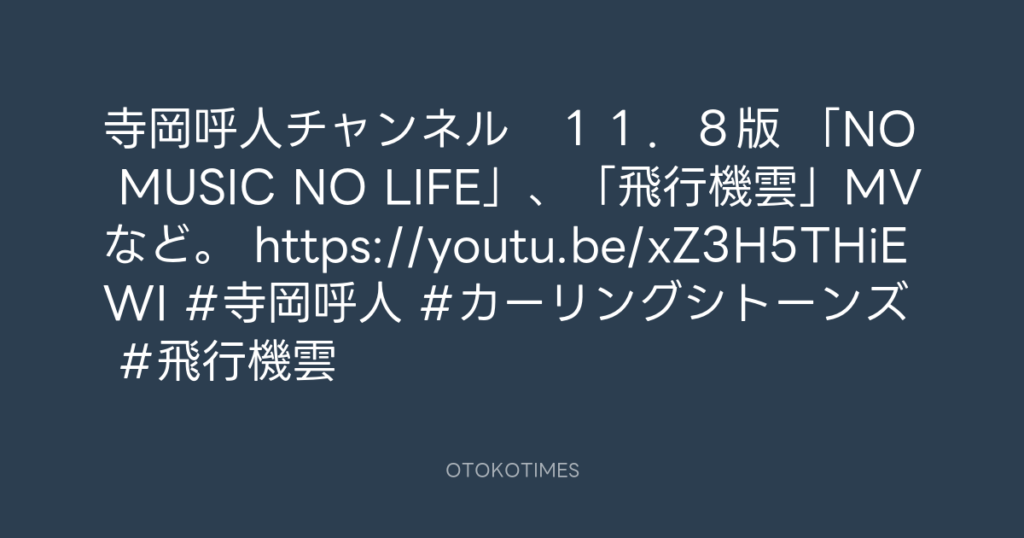 寺岡呼人チャンネル 11.8版 「NO MUSIC NO LIFE」、「飛行機雲」MVなど。 htt... -