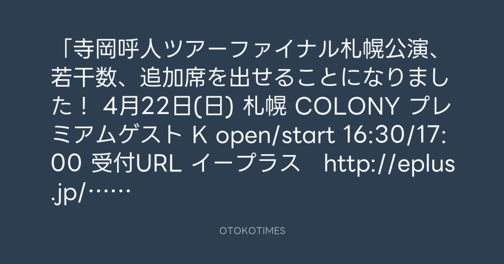 「寺岡呼人ツアーファイナル札幌公演、若干数、追加席を出せることになりました! ... -