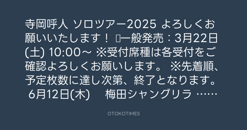 寺岡呼人 ソロツアー2025 よろしくお願いいたします! ★一般発売:3月22日 (土) 10... -