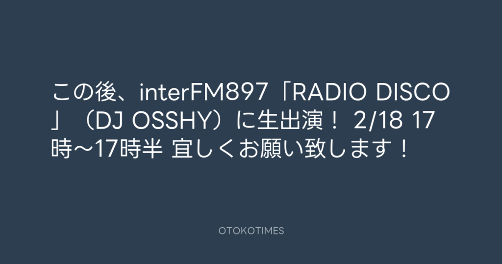 この後、interFM897「RADIO DISCO」(DJ OSSHY)に生出演! 2/18 17時〜17時半 宜... -