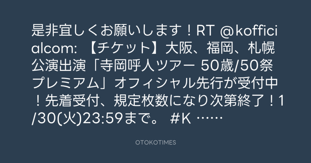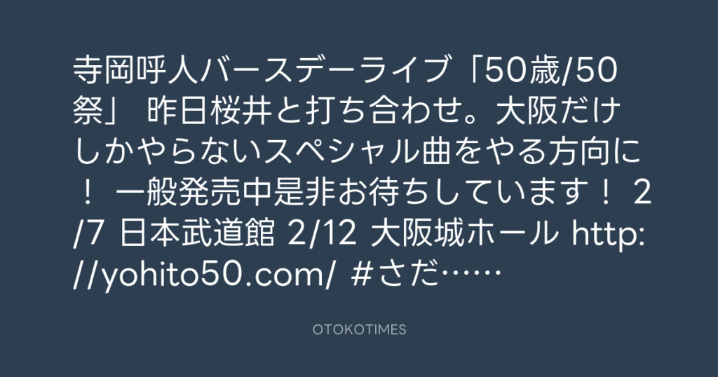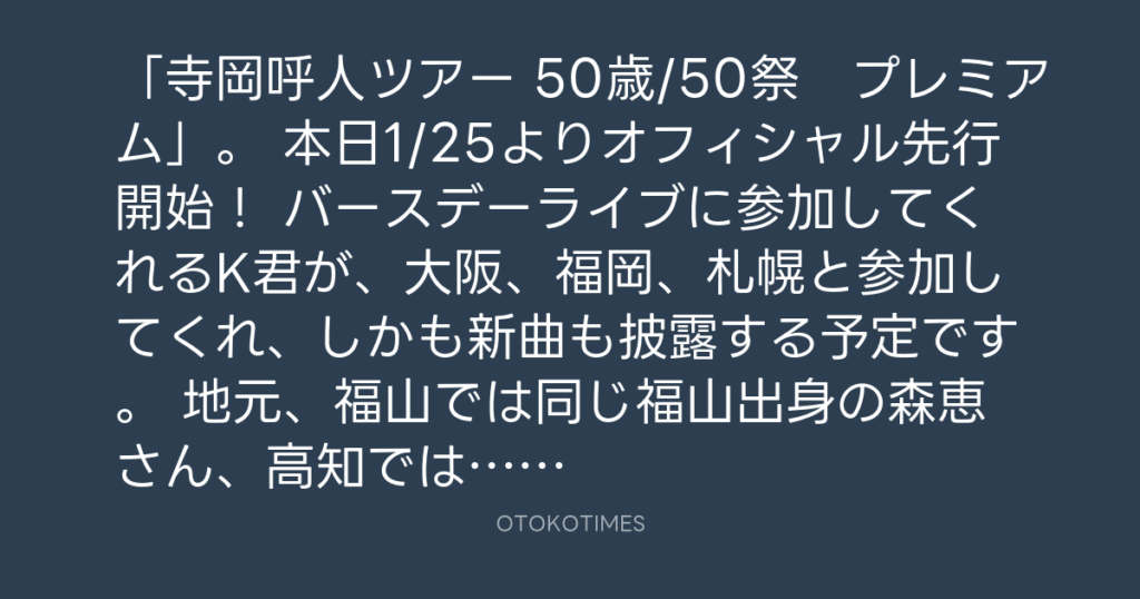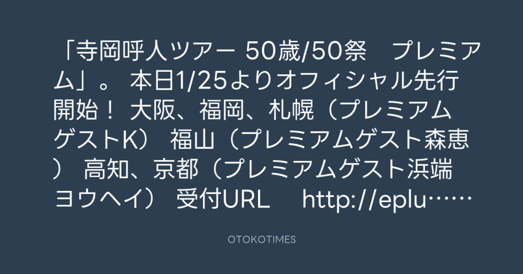 「寺岡呼人ツアー 50歳/50祭 プレミアム」。 本日1/25よりオフィシャル先行開... -