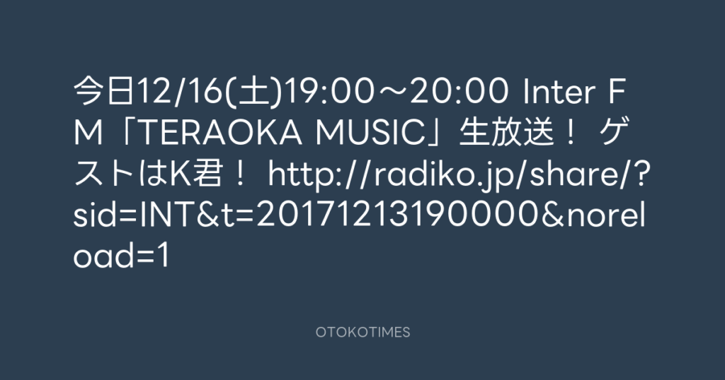 今日12/16(土)19:00~20:00 Inter FM「TERAOKA MUSIC」生放送! ゲストはK君! htt... -