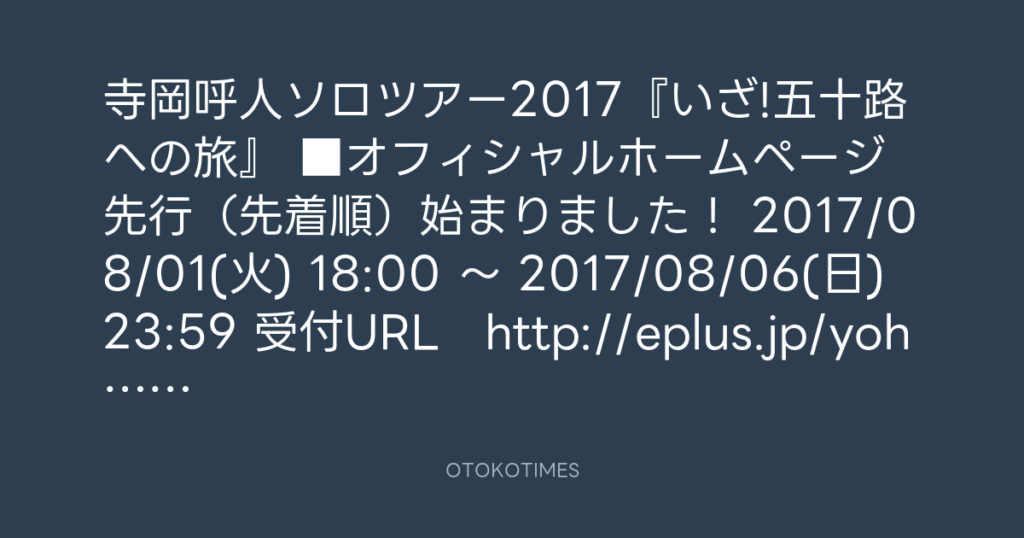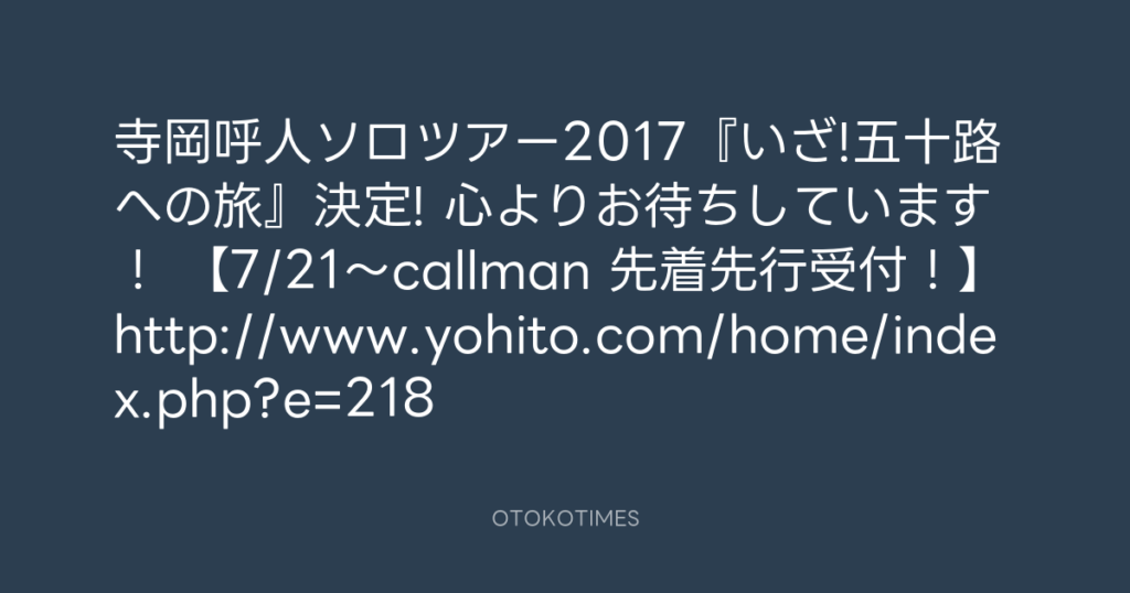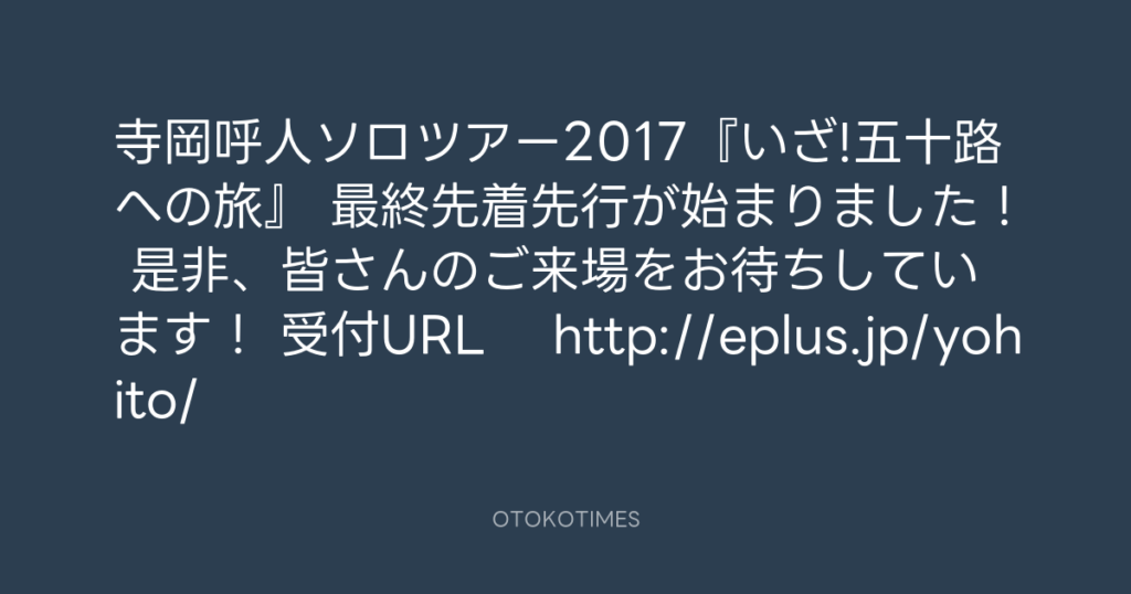 【拡散希望!】寺岡呼人ソロツアー2017『いざ!五十路への旅』先行受付中!7/31まで... -