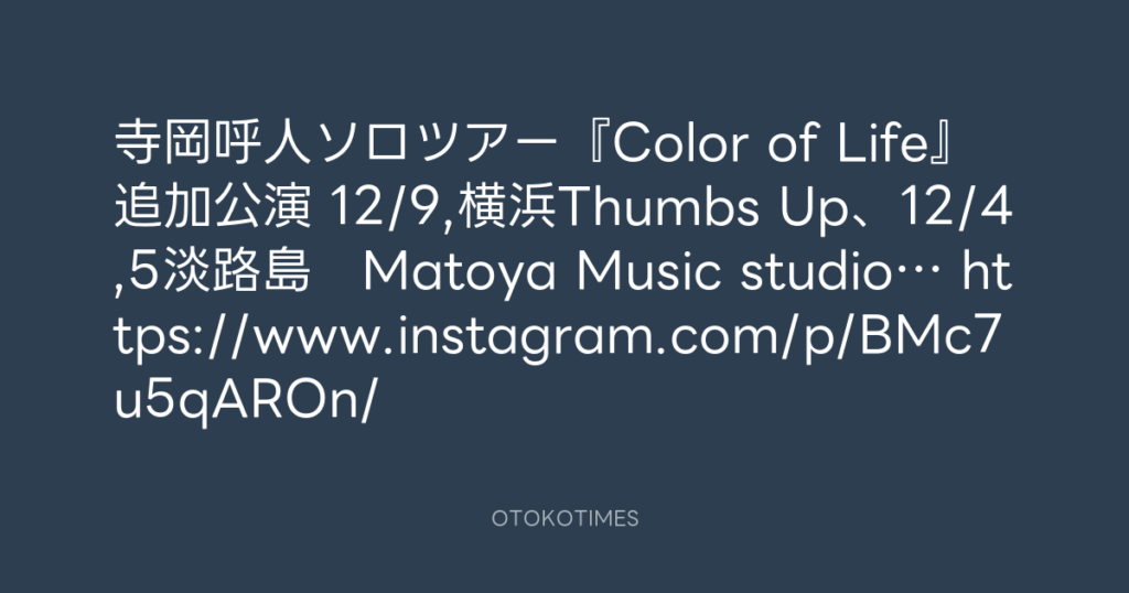 寺岡呼人ソロツアー『Color of Life』追加公演 12/9,横浜Thumbs Up、12/4,5淡路島... -