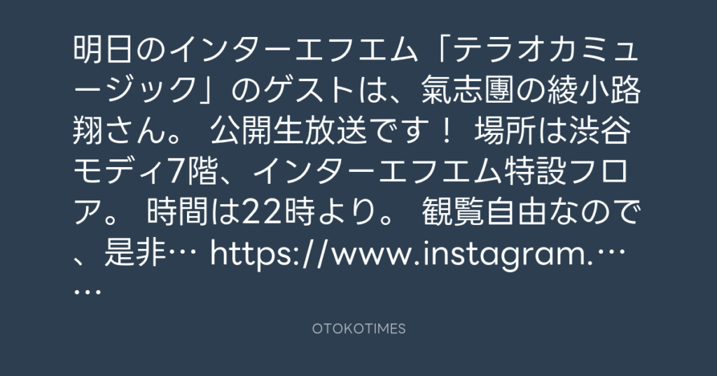 明日のインターエフエム「テラオカミュージック」のゲストは、氣志團の綾小路翔さ... -
