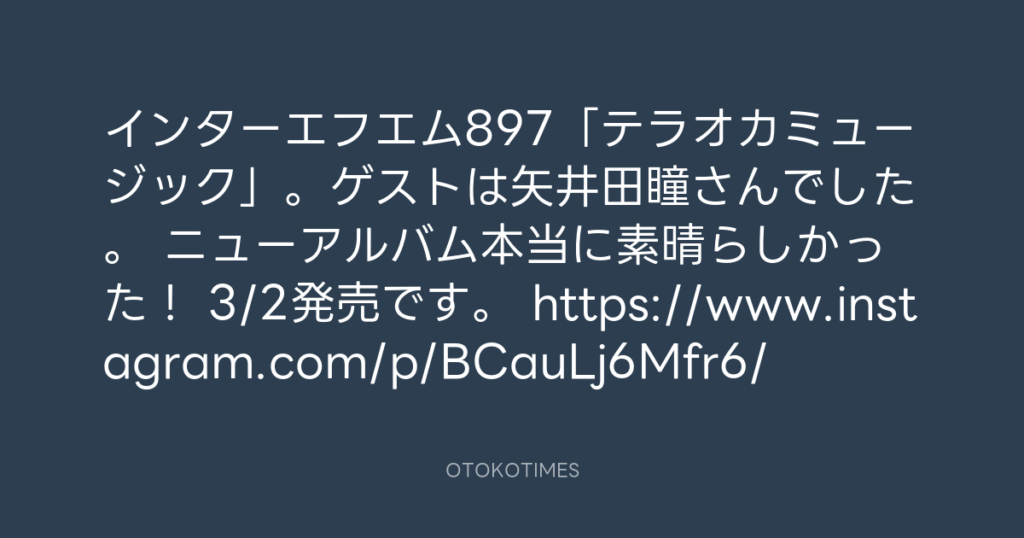 インターエフエム897「テラオカミュージック」。ゲストは矢井田瞳さんでした。 ニ... -