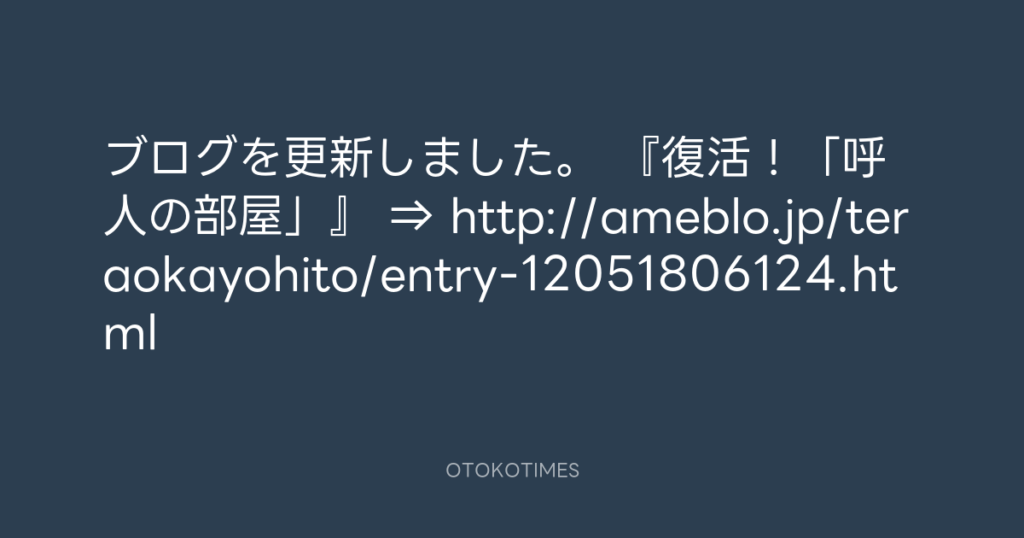 ブログを更新しました。 『復活!「呼人の部屋」』 ⇒ http://ameblo.jp/teraokayoh... -