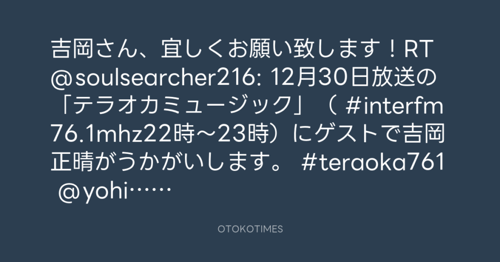 吉岡さん、宜しくお願い致します!RT @soulsearcher216: 12月30日放送の「テラオカ... -