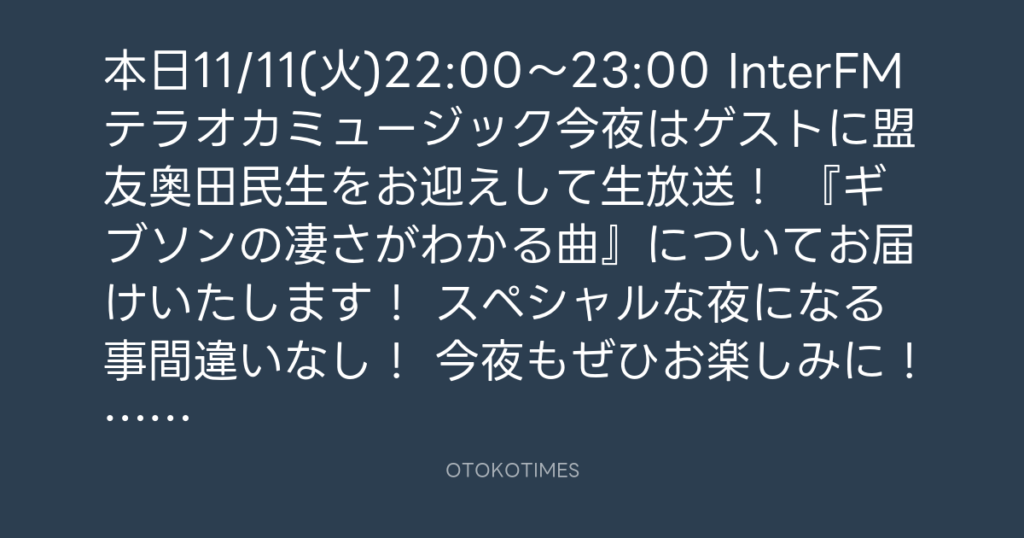 本日11/11(火)22:00〜23:00 InterFMテラオカミュージック今夜はゲストに盟友奥田民... -