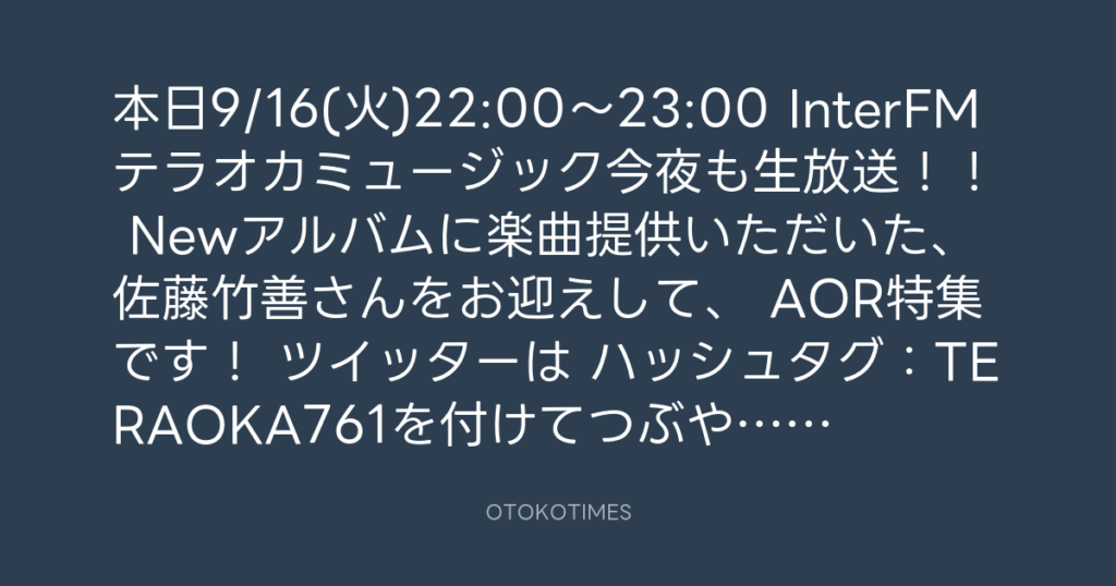 本日9/16(火)22:00〜23:00 InterFMテラオカミュージック今夜も生放送!! Newアル... -