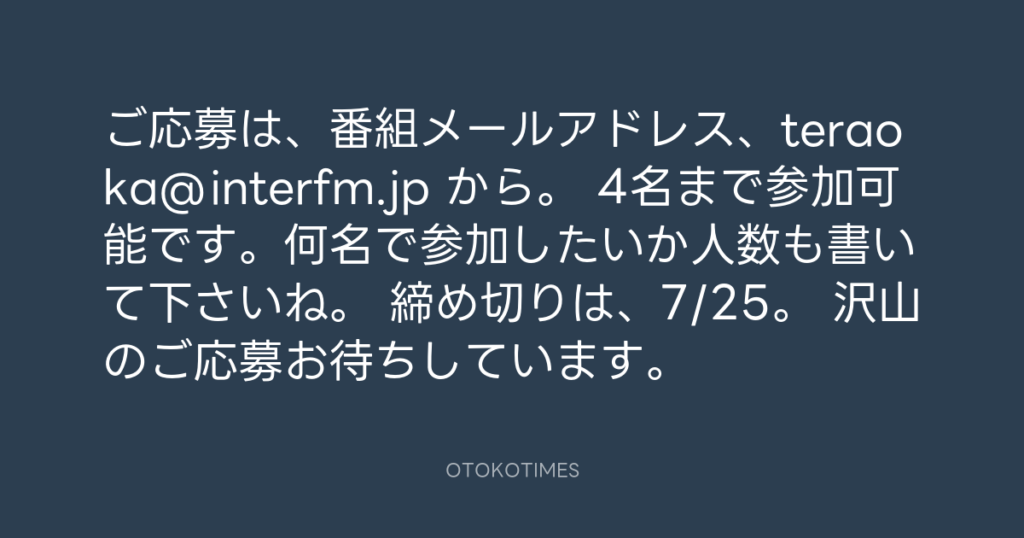 ご応募は、番組メールアドレス、teraoka@interfm.jp から。 4名まで参加可能です。...
