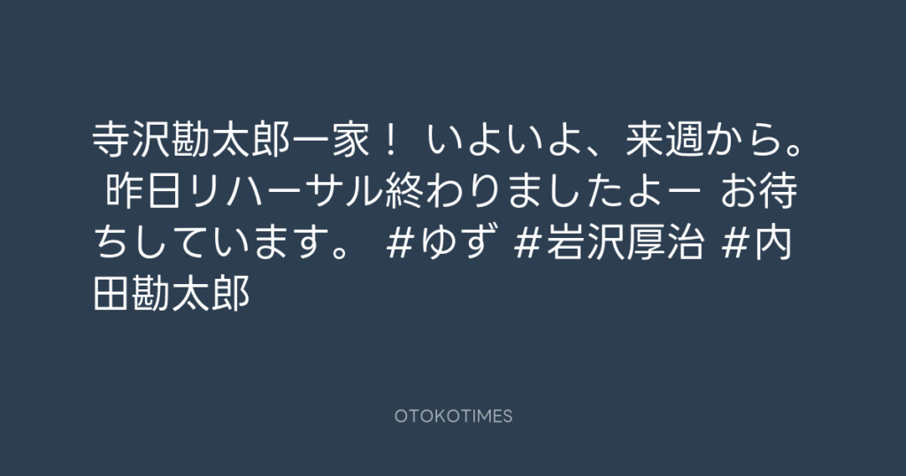 寺沢勘太郎一家! いよいよ、来週から。 昨日リハーサル終わりましたよー😉 お待ち... -