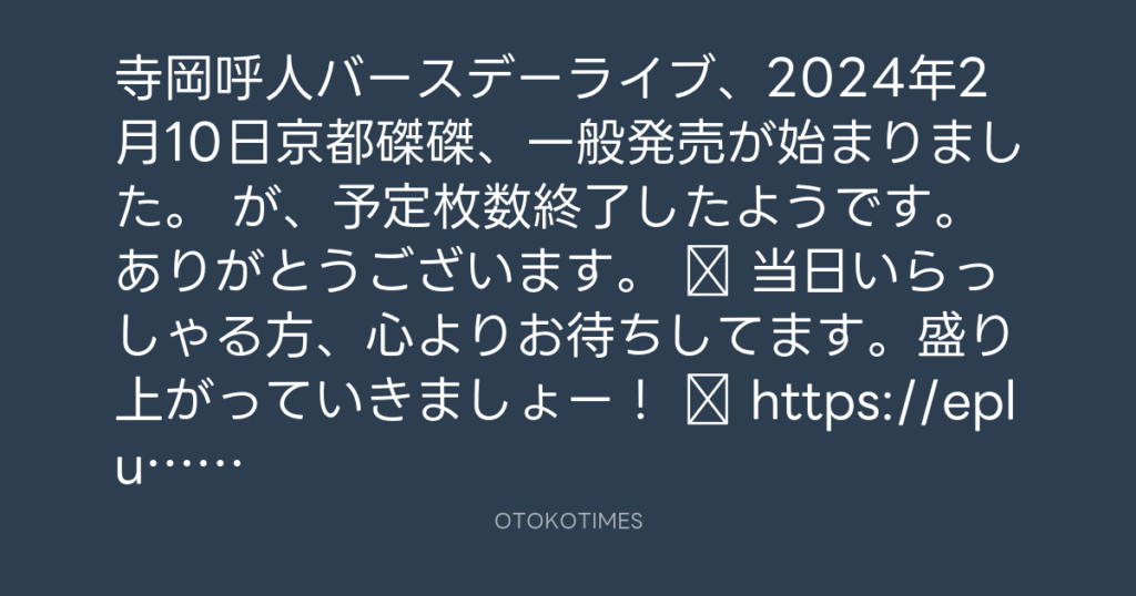 寺岡呼人バースデーライブ、2024年2月10日京都磔磔、一般発売が始まりました。 が... -