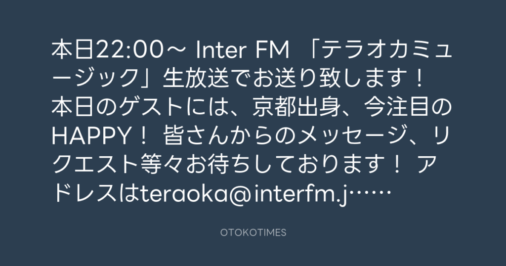 本日22:00〜 Inter FM 「テラオカミュージック」生放送でお送り致します! 本日の... -