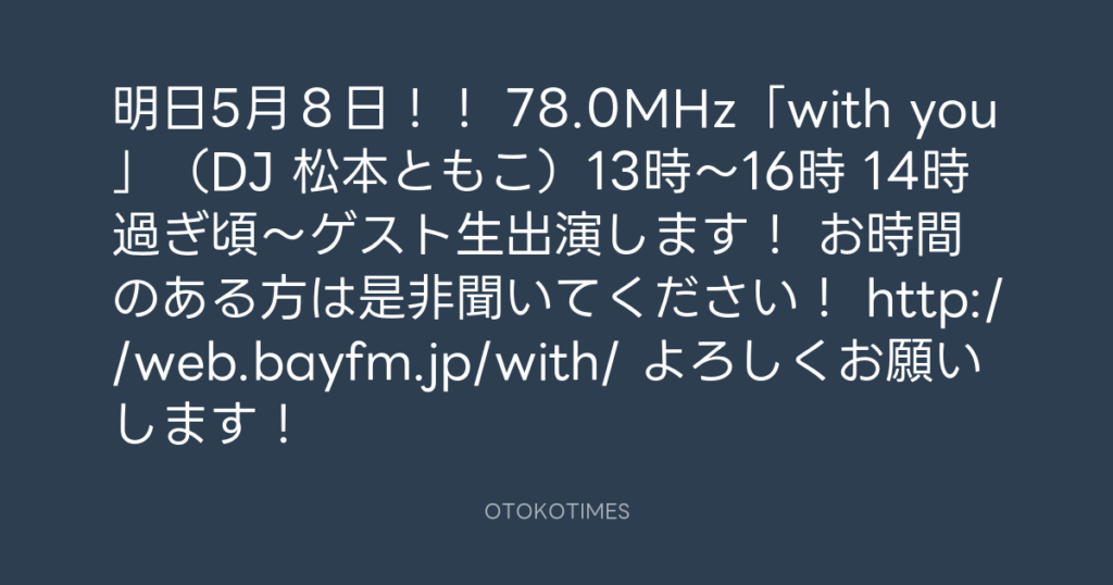 明日5月8日!! 78.0MHz「with you」(DJ 松本ともこ)13時〜16時 14時過ぎ頃〜ゲ... -