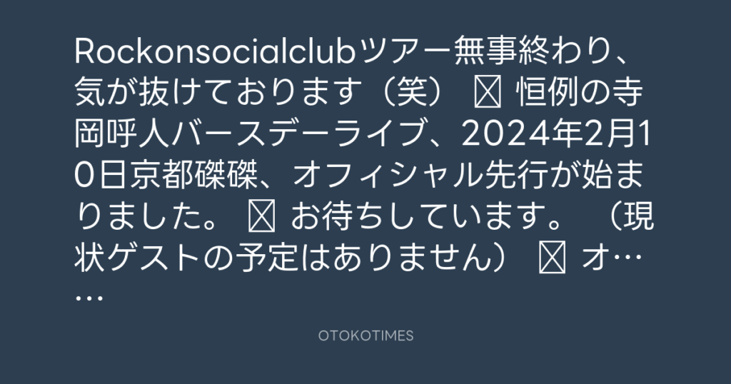 Rockonsocialclubツアー無事終わり、気が抜けております(笑) 恒例の寺岡呼人バ... -