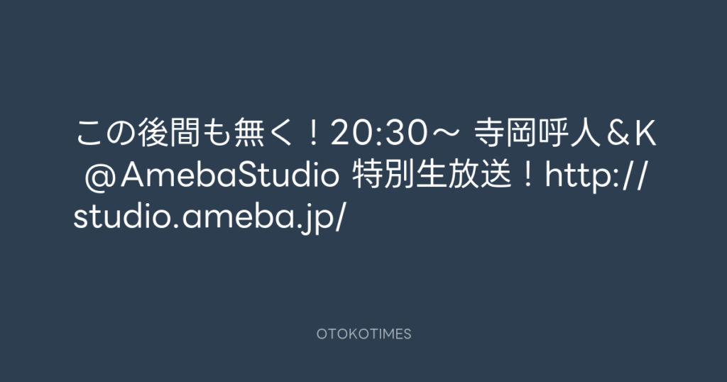 この後間も無く!20:30〜 寺岡呼人&K @AmebaStudio 特別生放送!http://studio.am... -